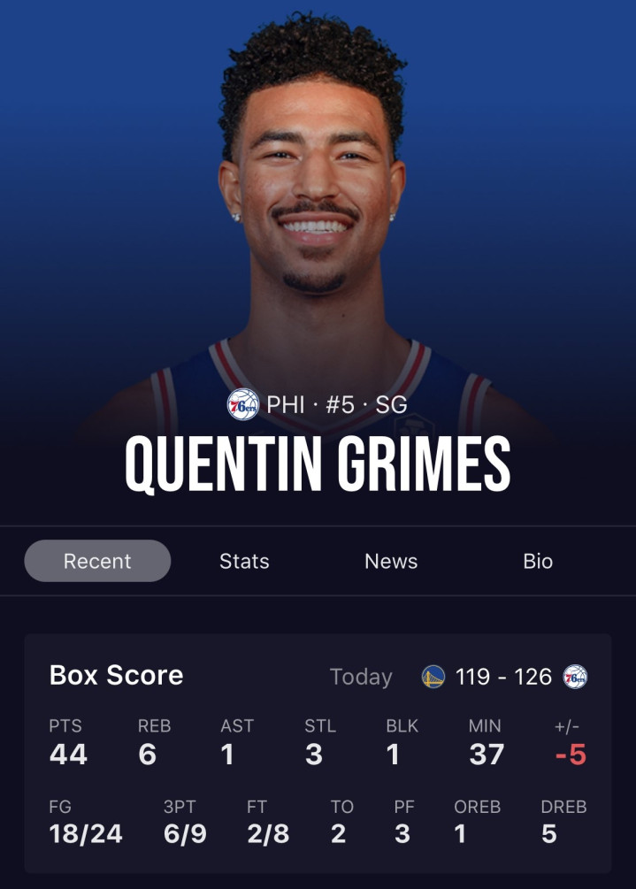 此役,76人后卫、独行侠旧将格莱姆斯表现神勇,他上场36分43秒24投18中,三分9中6、罚球8中2,砍下44分创生涯新高,还有6篮板1助攻3抢断1封盖进账。